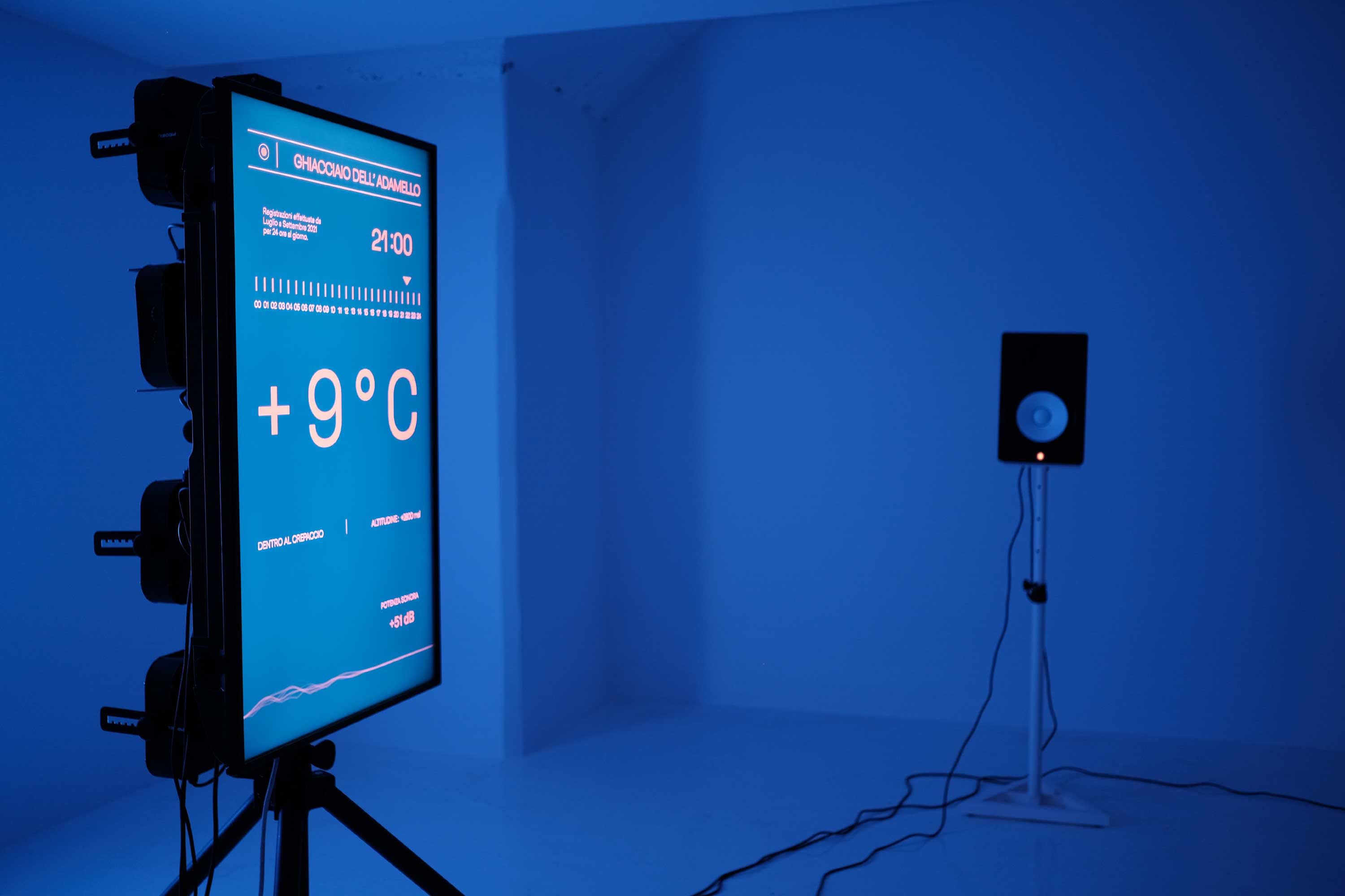 L’installazione “ABLAZIONE SONORA” racconta e riassume 24 ore di attività fusoria del ghiacciaio dell'Adamello attraverso i suoi “lamenti”. Mediante l'utilizzo di 4 registratori bioacustici collocati scientificamente nel ventre di crepacci e fessure durante l'estate del 2021, sono state acquisite più di 3880 ore di registrazioni ottenendo così una banca dati di suoni in continuo aggiornamento. L'installazione mostra i dati scientifici raccolti attraverso una dimensione percettiva ed emotiva coinvolgente, consentendo così un punto di vista inedito sulle implicazioni e conseguenze negative del cambiamento climatico sugli ecosistemi fragili. Il 92% dei ghiacciai alpini rischia di scomparire entro la fine di questo secolo.